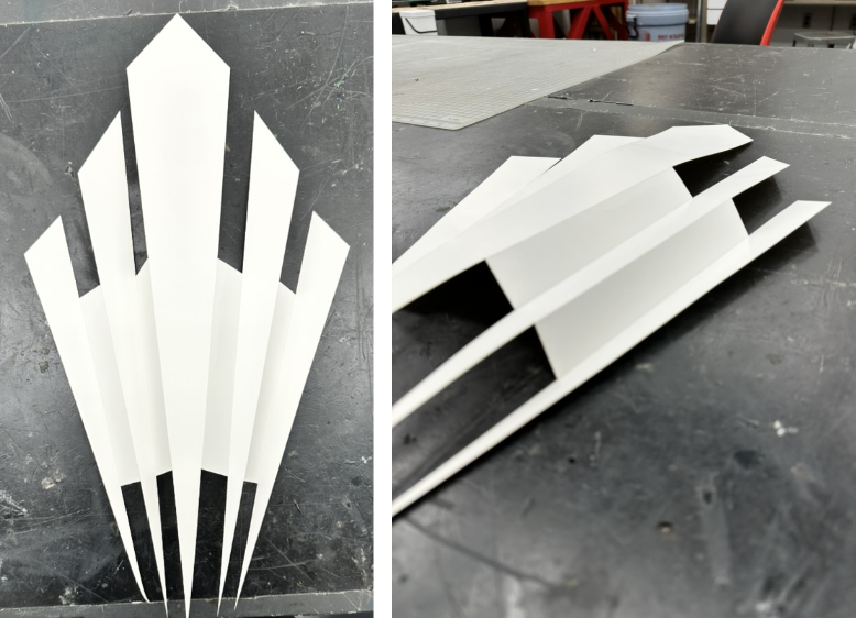 After finalizing the shade’s overall design, it was time to bend the folds and realize the depth and character of this project. By folding the edges, the empire style truly came through and the pop of the project started to be realized.